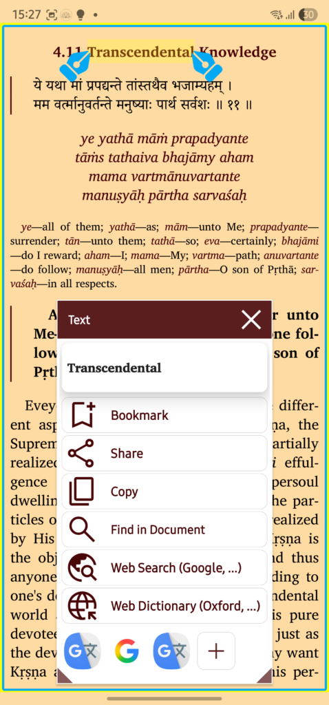 This is electronic version of the book “Bhagavad-gītā As It Is” 1972, Macmillan edition, with diacritics, listening to shlokas in Sanskrit and standard functions: