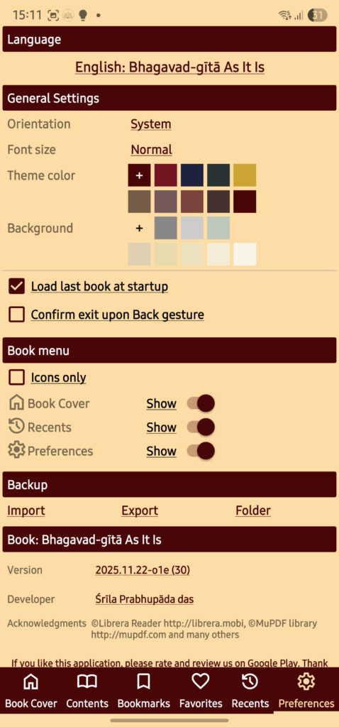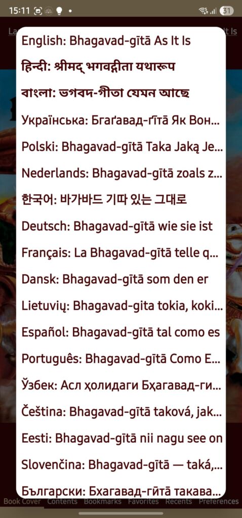 This app uses various translations (texts) of “Bhagavad-gītā As It Is” book that are freely available on the Internet, and received by developers free of charge from anonymous.