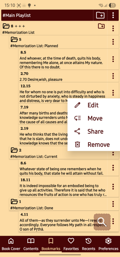 - list of “Bookmarks” (i.e. named notes on shlokas)